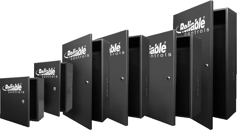 Reliable Controls offers nine enclosures that provide an economical, professional, branded solution for equipment protection. Purpose-built for the controls industry, Reliable Controls enclosures maximize the number of Reliable Controls devices you can accommodate. All enclosures are made from 16-gauge steel and include a key lock, a detachable backplate, and knockouts for conduit entry.