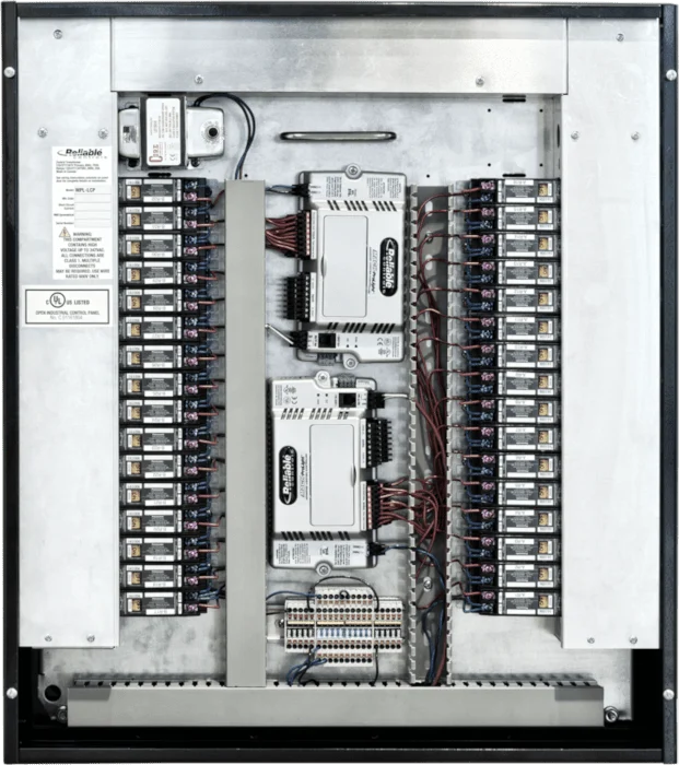 The Reliable Controls Medium Lighting Control Panel is a complete assembly of controls and switching relays wired for installation in an electrical system. Customize the Medium Lighting Control Panel with your choice of MACH‑ProLight controllers, relays, wiring, and transformer input voltage to meet your lighting control strategy needs.