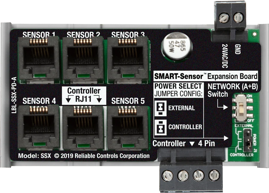 For SMART-Net devices that use modular RJ11 connections, the Reliable Controls SMART-Sensor Expansion Board maximizes both the number of SMART-Sensor devices you can use and the combined SMART-Net cable length you can connect to a host controller.